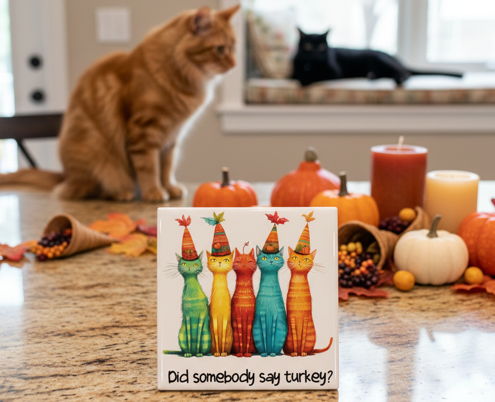 Celebrate the cozy spirit of Thanksgiving with this delightful “Did Somebody Say Turkey?” cat art print. Featuring five colorful, party-hat-wearing cats surrounded by festive autumn tones, this piece brings warmth, humor, and personality to any space.