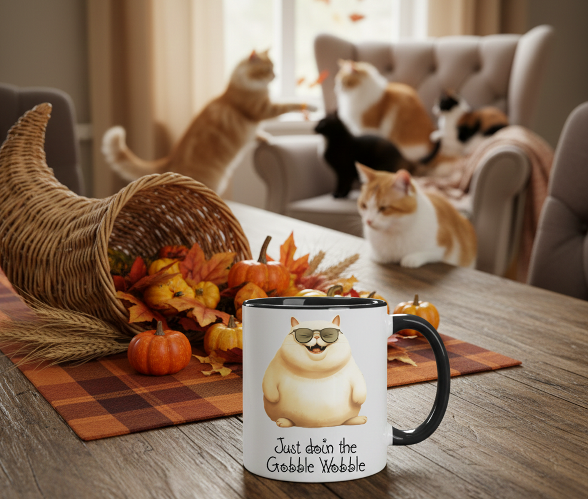 Featuring a delightfully plump, shades-wearing cat living his best “Gobble Wobble” life, this mug is the perfect mix of holiday cheer and feline sass. Whether you’re sipping pumpkin spice, plotting your escape from dinner conversation, or simply admiring your cat’s complete lack of gratitude, this mug is your seasonal sidekick.