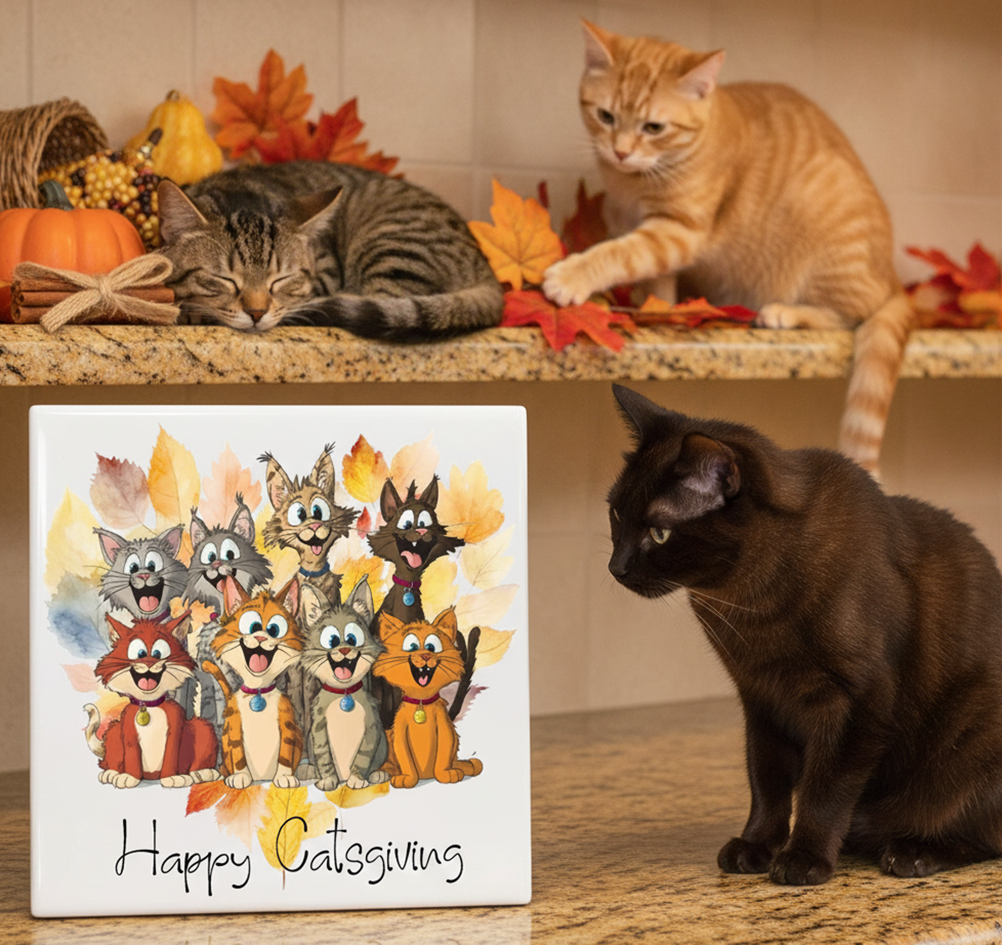 Your cat doesn’t care about the turkey, the parade, or Aunt Carol’s casserole. They care about snacks and attention. This “Happy Catsgiving” decorative ceramic tile captures that feline attitude in festive, funny style.