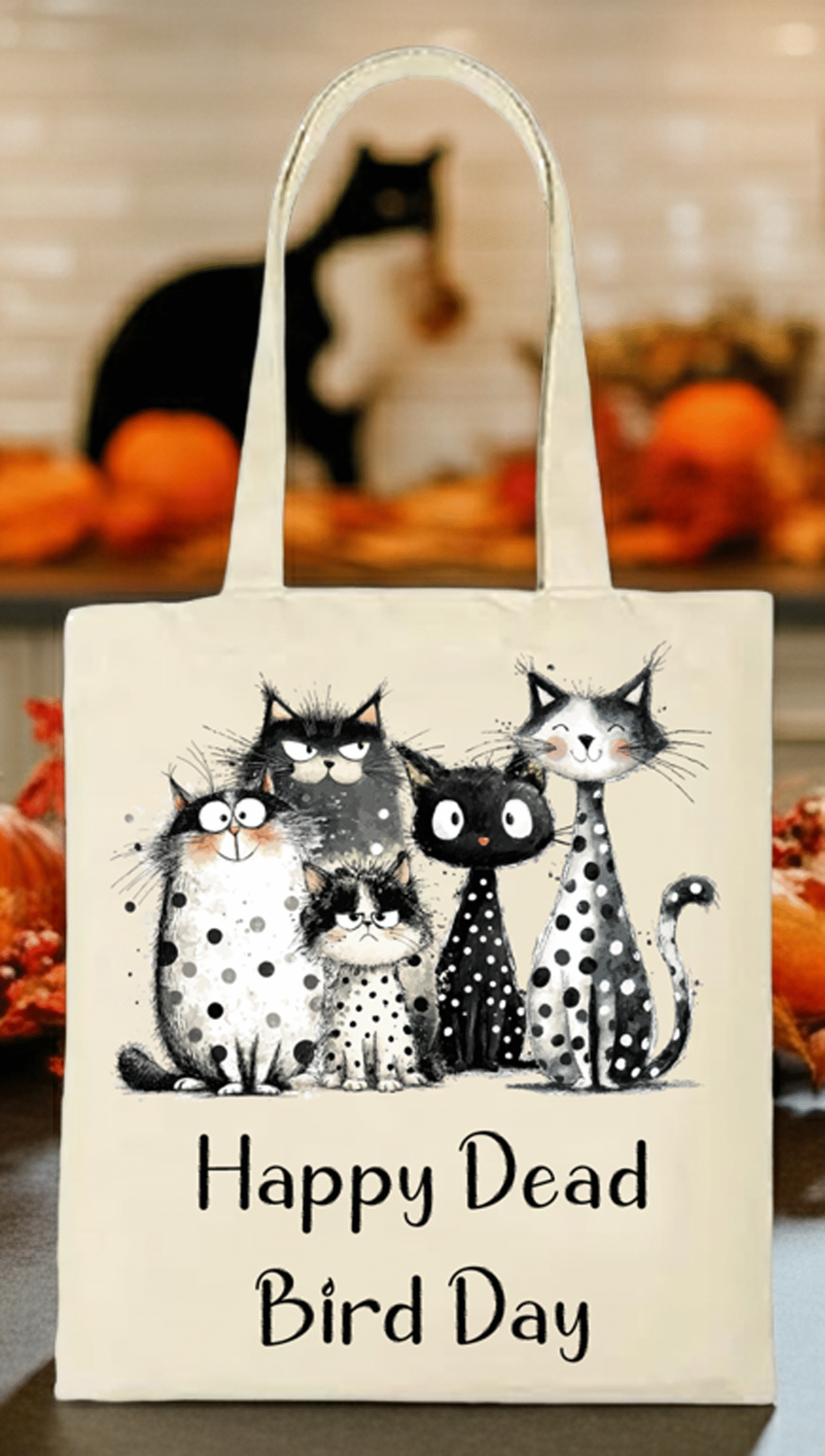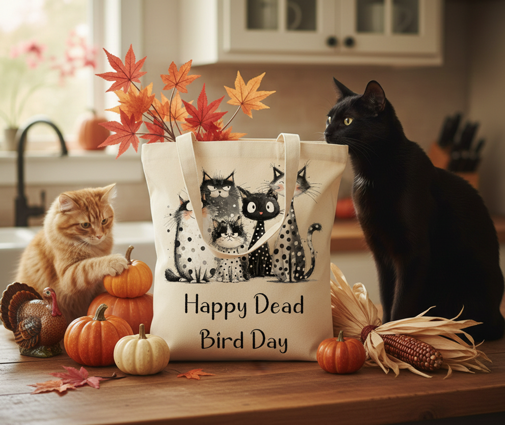 Celebrate Thanksgiving the way your cats really do—with a tote bag that gets it. Featuring a quirky group of black-and-white polka-dot cats and the hilariously blunt message, “Happy Dead Bird Day,” this bag is purrfect for cat enthusiasts with a sense of humor.
