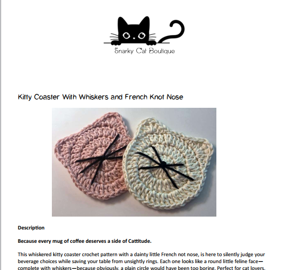 Bring a smile to your face and warmth to your home with the Kitty Mug Rug Crochet Pattern by Snarky Cat Boutique. This pattern allows you to create an adorable cat head shaped mug rug that serves as both a functional coaster and a whimsical decoration.