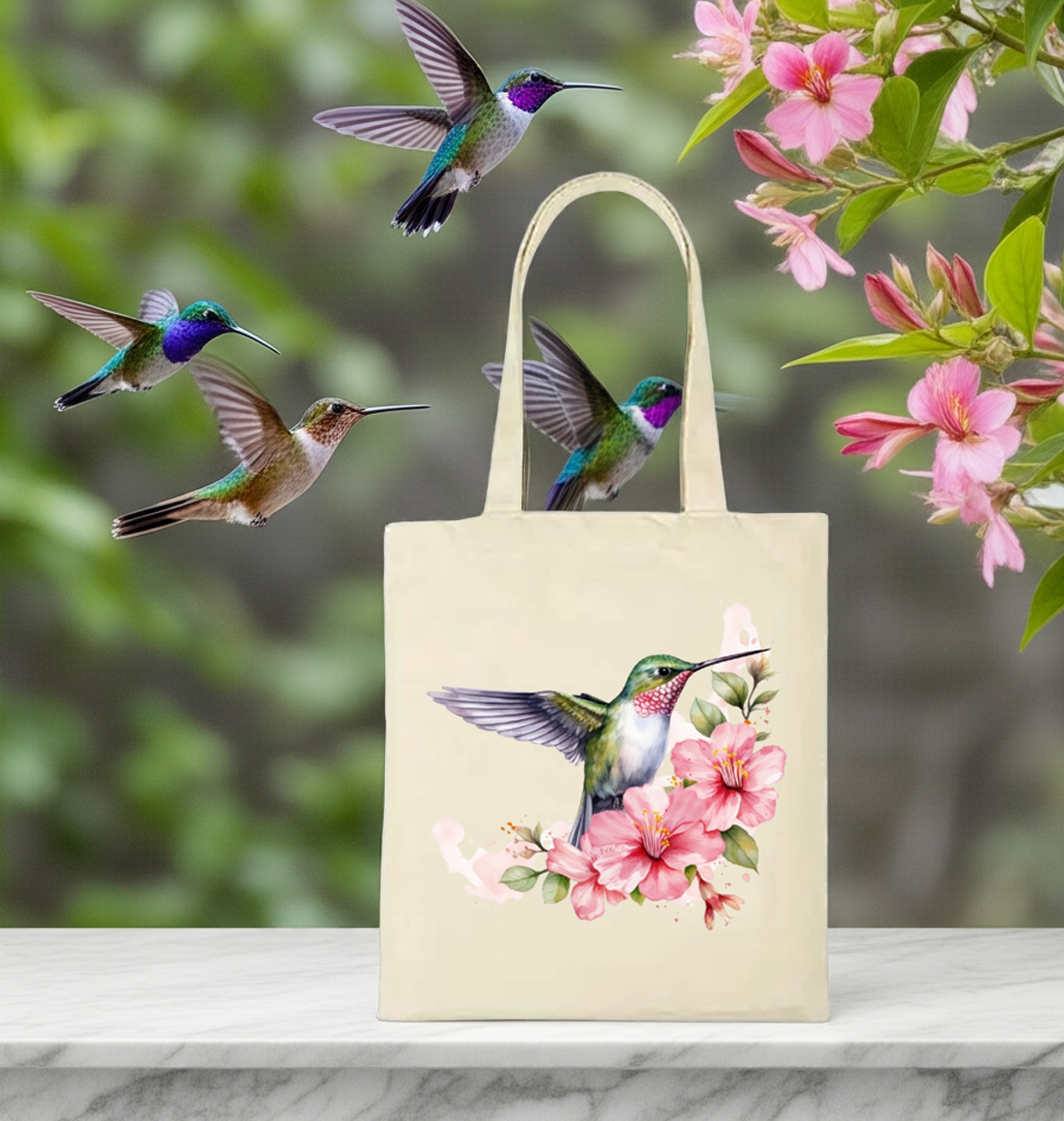 The Nature’s Jewel Tote—for cat parents who appreciate beauty, chaos, and fur on everything they own. Featuring a delicate hummingbird design on sturdy beige polyester canvas, this tote is proof that elegance and cat hair can coexist.