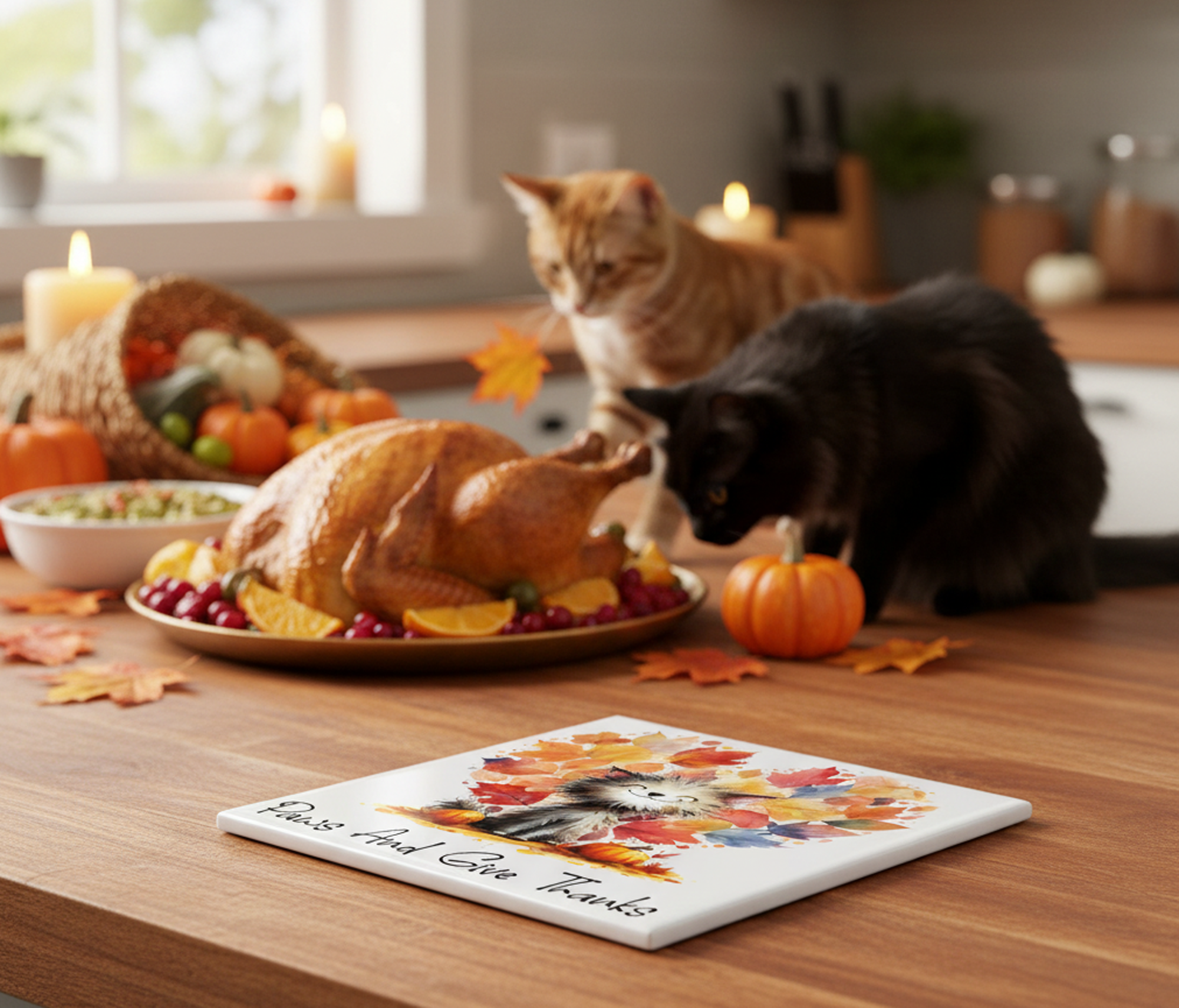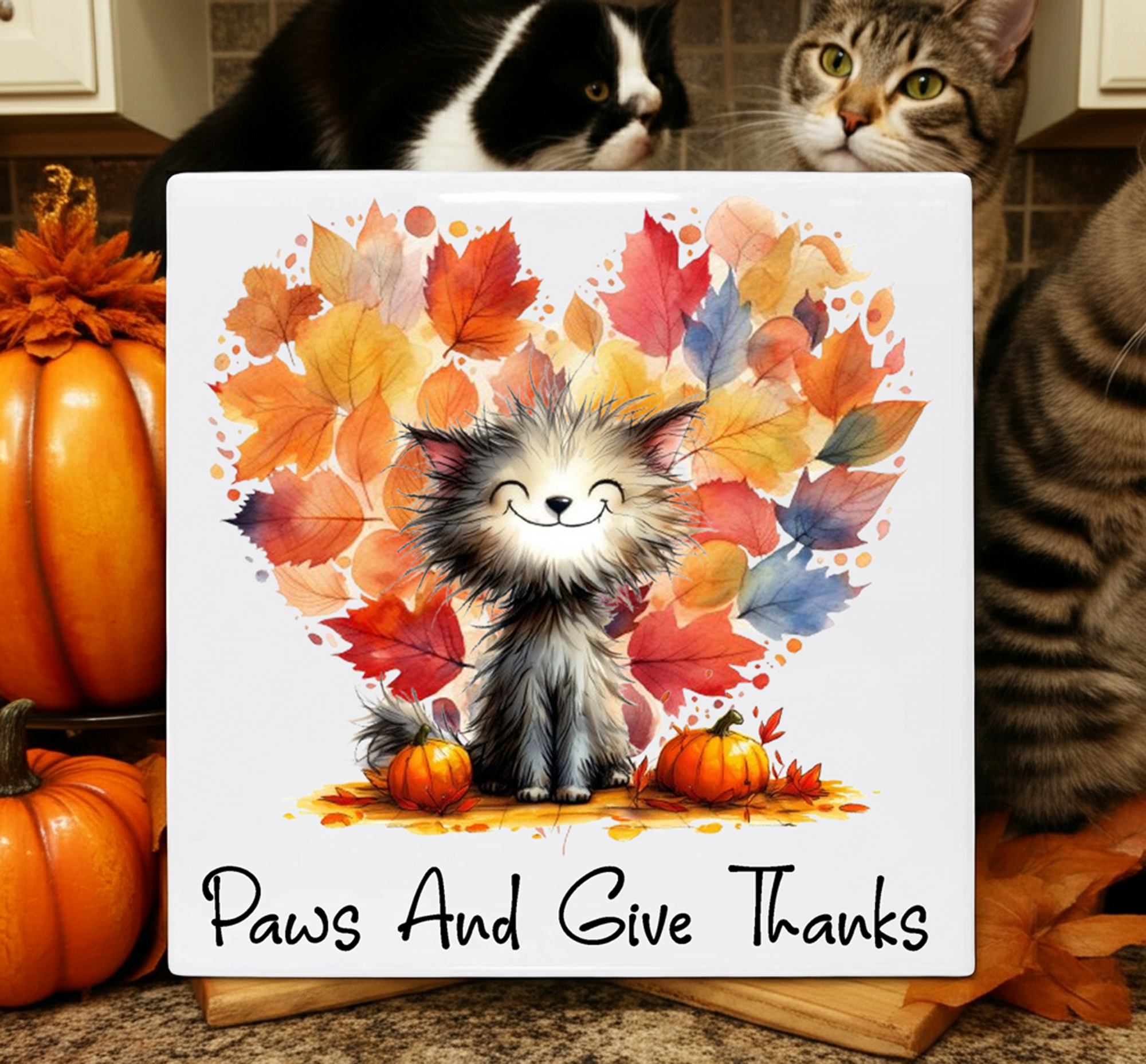 Crafted with high-quality materials, this tile is durable and ready to brighten your home for years to come. Add a touch of feline happiness and autumnal beauty to your decor today!