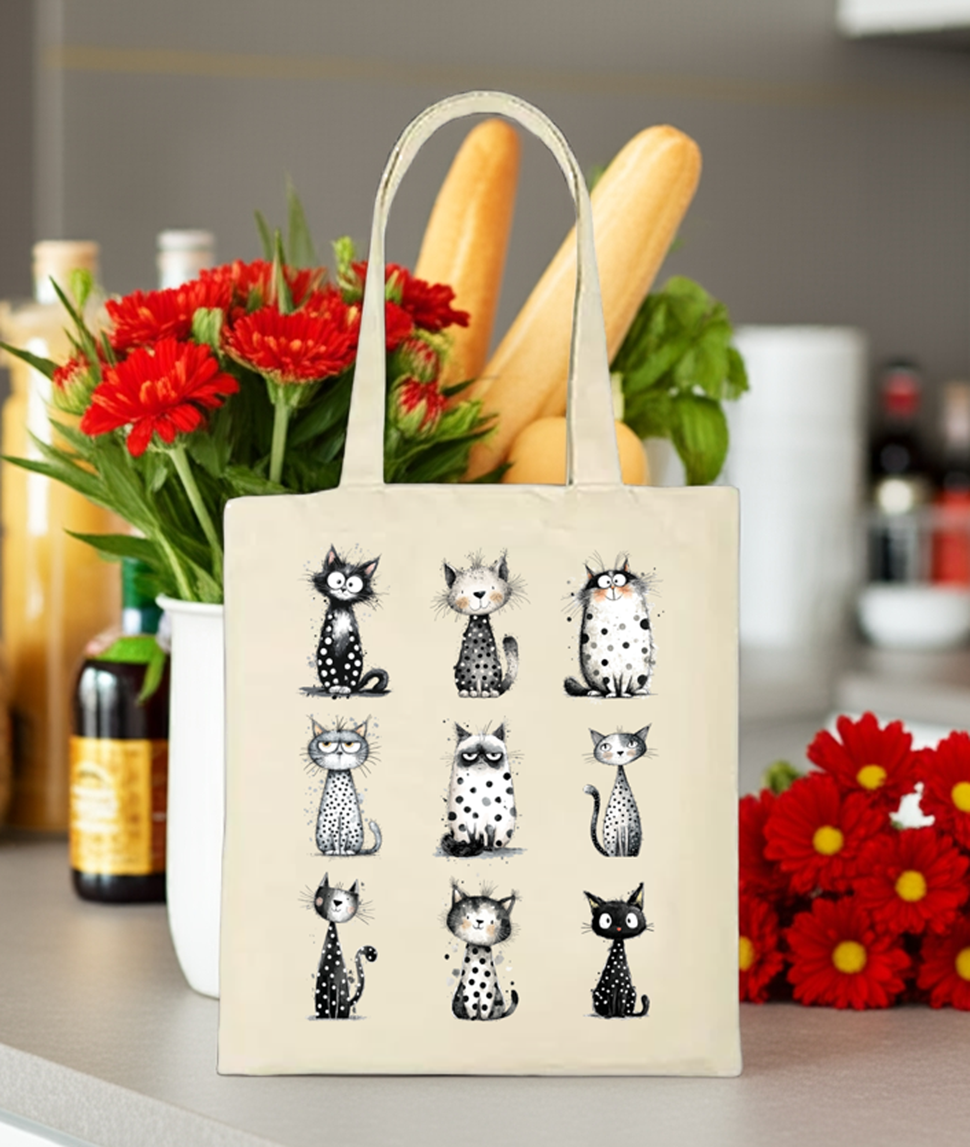 Who says practical can’t be purr-sonality-packed? Our Polka Dot Cats Tote Bag is here to carry your groceries, secrets, and questionable life choices—with style. Featuring bold cats and playful polka dots, this durable polyester canvas tote laughs in the face of flimsy bags. Made-to-order in Albuquerque, New Mexico, it’s as unique as your cat’s mood swings.