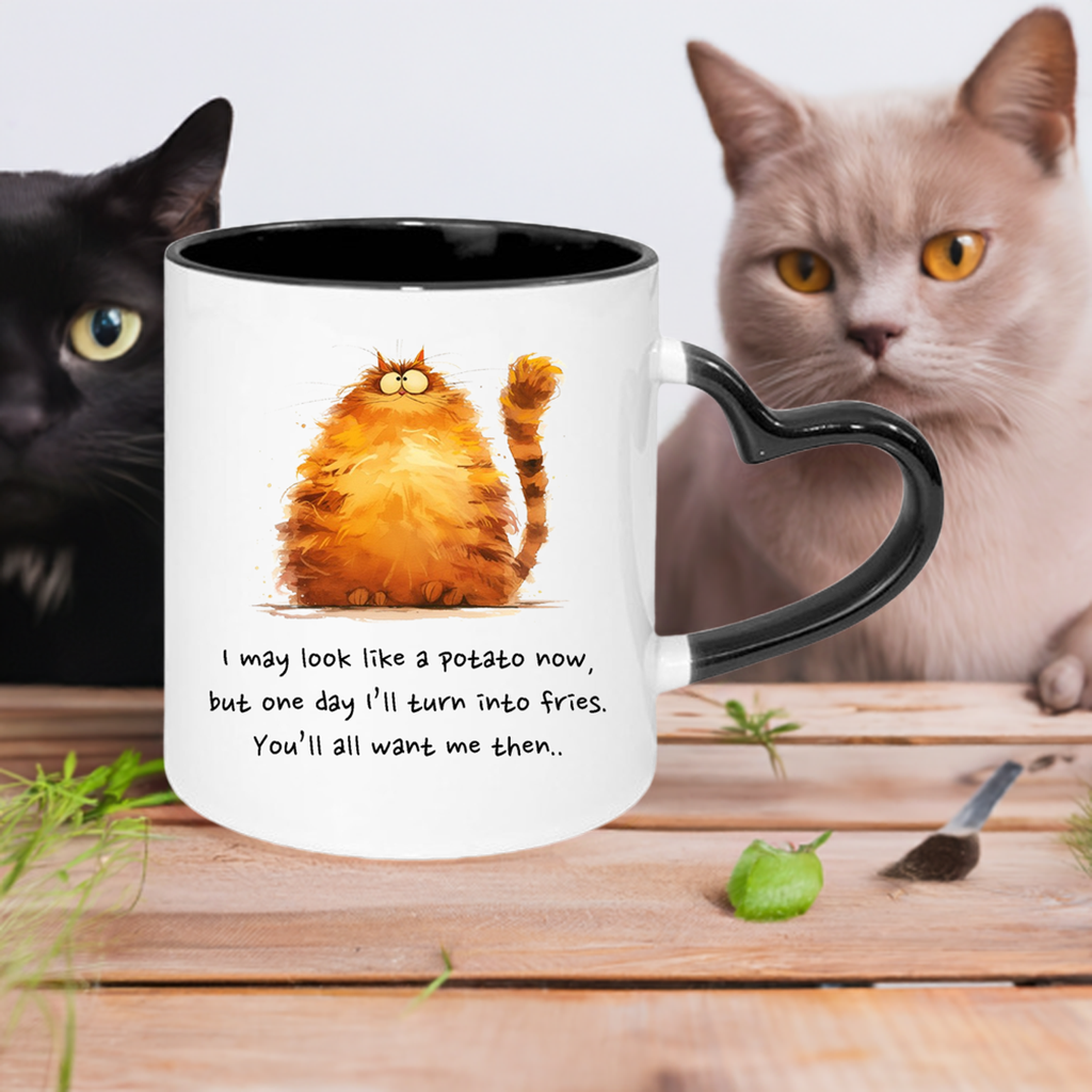 Show your kitty love! Two-tone white ceramic with black heart shaped handle and black inside. Adorable AND, you can’t see the coffee or tea stains!