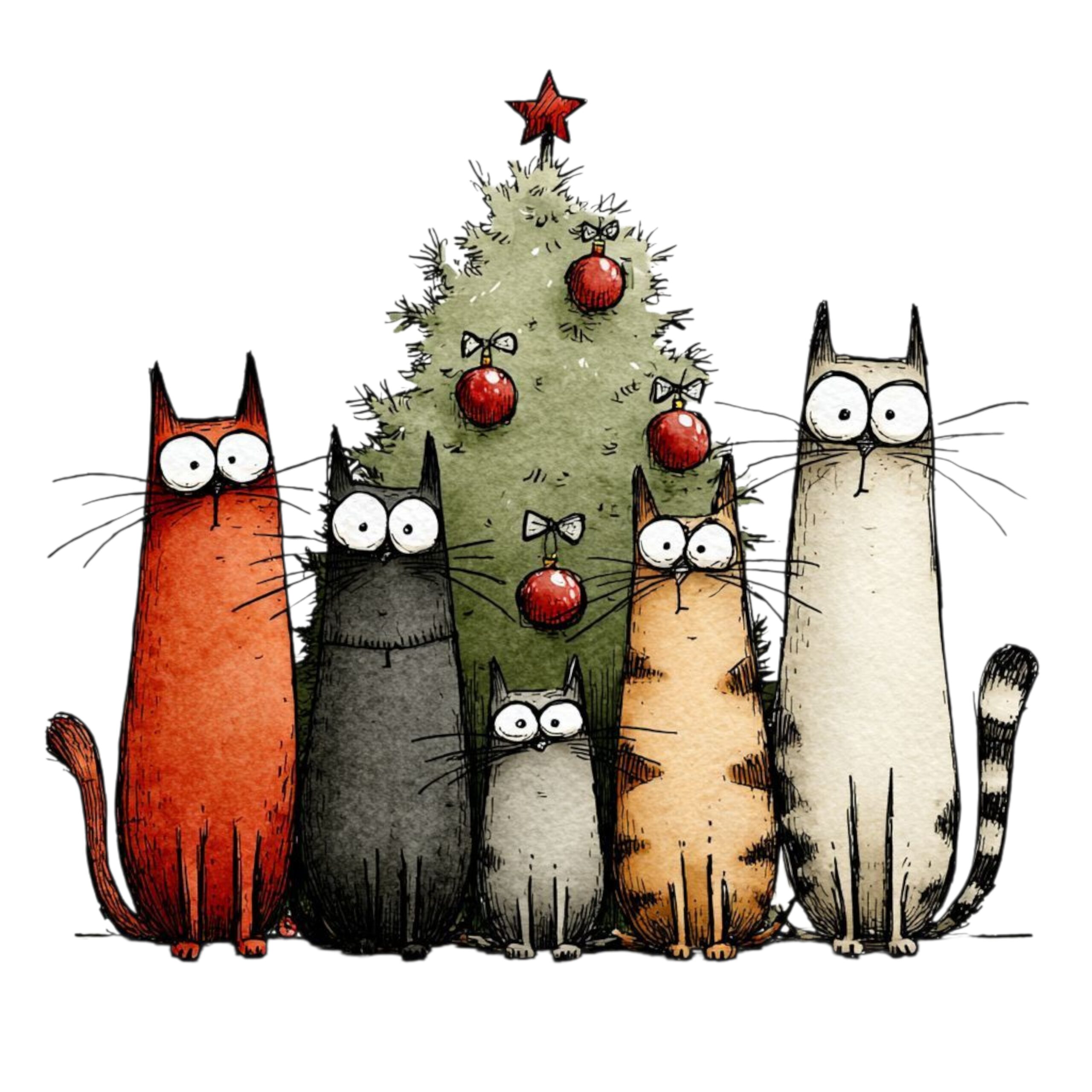 Ah yes. That dreaded stretch between Thanksgiving leftovers and Christmas chaos has begun. While you grapple with eggnog, tangled lights, and existential dread, your cat is plotting. They prepare to sabotage ornaments and rearrange the tinsel (actually you shouldn’t be using tinsel – very dangerous for kitties), and determine how long it will take them to reach the top of the tree to get that shiny, dangly thing.
